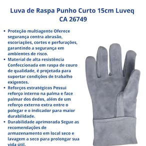 Especificações técnicas Marca: Luveq. CA: 26749. Material: Raspa de couro. Comprimento do punho: 15 cm. Características: Reforço interno na palma e face palmar dos dedos, reforço externo entre polegar e indicador. Níveis de desempenho EN 388: 4244 (Resistência à abrasão 4, Resistência ao corte por lâmina 2, Resistência ao rasgamento 4, Resistência à perfuração por punção 4).