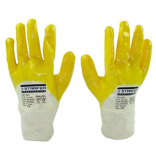 A Luva em Malha Tricotada Revestida de Nitrílico Parcial Amarela Tamanho M da Starfer é uma peça de segurança confeccionada em malha de algodão tricotada em uma única peça, destacando-se pelo revestimento nitrílico na face palmar e 3/4 da plantar, acompanhada por um punho elástico para ajuste otimizado. Possui o Certificado de Aprovação CA Nº 49.472, disponível no tamanho 8/M, e apresenta uma combinação de cores, sendo a palma, ponta dos dedos e parte do dorso em amarelo, enquanto a porção restante do dorso e o punho são em tom bege.
