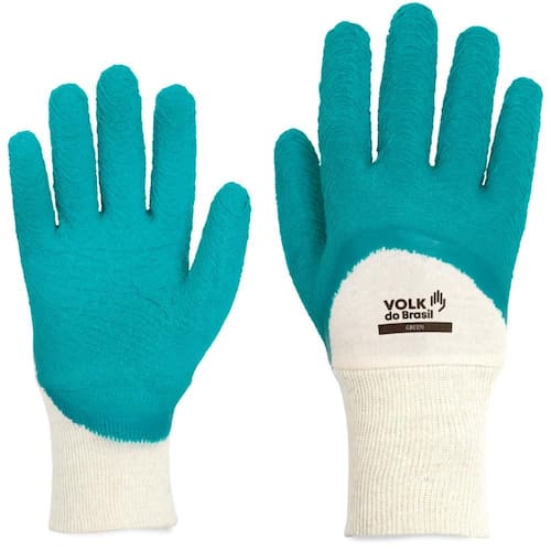 Luva de segurança confeccionada em fibras naturais tipo interlock, revestimento da face palmar, ponta dos dedos e dorso dos dedos em látex corrugado, punho de malha costurado.