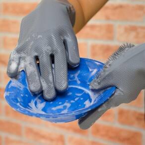 Cerdas finas, profundas e circulares na palma da luva e nos dedos que auxiliam na limpeza de lugares menores e na descontaminação.