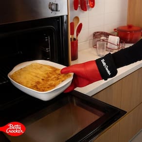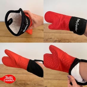 A Luva Térmica da Betty Crocker é produzida em 100% silicone resistente ao calor, garantindo máxima proteção durante o manuseio de utensílios quentes.