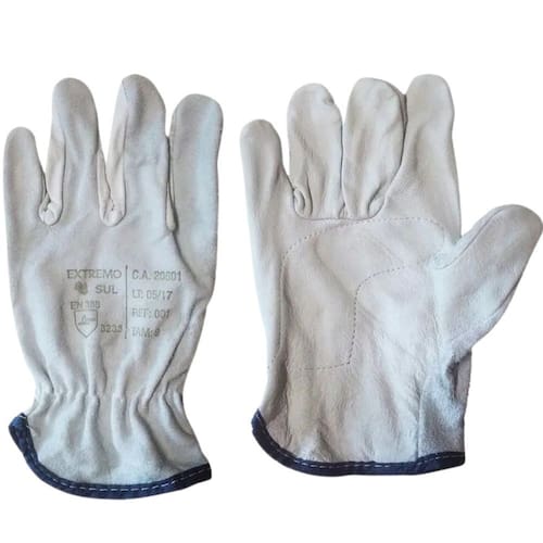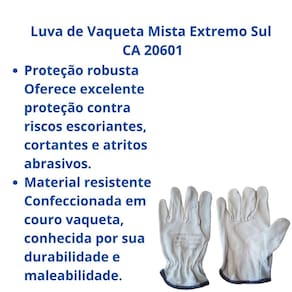 Luva de Vaqueta Mista Extremo Sul CA 20601 Proteção Mecânica Essencial e Versátil Luva de segurança com dorso confeccionado em couro bovino tipo raspa e palma em couro tipo vaqueta, que garante flexibilidade e resistência. Possui reforço palmar interno para maior durabilidade e elástico embutido no dorso para um ajuste firme e confortável. As costuras são feitas com linha de nylon e o acabamento em viés, proporcionando um equipamento robusto e de qualidade para diversas atividades.
