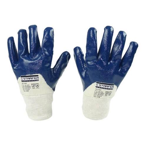 A Luva em Malha Tricotada Revestida de Nitrílico Parcial Azul Tamanho M da Starfer é uma peça de segurança confeccionada em malha de algodão tricotada em uma única peça, destacando-se pelo revestimento nitrílico na face palmar e 3/4 da plantar, acompanhada por um punho elástico para ajuste otimizado. Possui o Certificado de Aprovação CA Nº 49.476, disponível no tamanho 8/M, e apresenta uma combinação de cores, sendo a palma, ponta dos dedos e parte do dorso em azul, enquanto a porção restante do dorso e o punho são em tom bege.