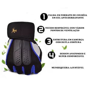 Tecido respirável na parte superior com um escudo siliconado com oríficio de ar e nas palmas das mãos para melhorar a circulação do suor. Possui costuras reforçadas. A palma da luva de espuma siliconada absorve a vibração e oferece maior conforto por muto tempo durante a prática de várias atividades fisicas A palma da luva tem orífios respirável e pontos de silicone que impedem que escorregue durante o exercício. Cobertura de meio dedo para movimentos livres e aderência segura durante a sua atividade. Devido ao design inovador e com a composição de vários tipos de tecido, faz com que tenha um ótimo ajuste e fique super confortável e também graças ao seu design ergonômico para suas mãos, ideal para várias praticas esportivas como musculação, ciclismo, levantamento de peso, escalada e etc... Tira para os punhos chamado de munhequeira com fechamento de fita: macho e fêmea para manter as luvas no lugar e dar mais firmeza nos punhos durante seus exercícios, na costas da luva tem uma camada de estrutura siliconada com orifícios respiráveis, e dão mais sustentação e firmeza ao práticar seus esportes. Especificações: Marca: Gold Sports Materiais: Poliamida, algodão, poliester, silicone, espuma, espuma e microfibra Garantia: 30 dias contra defeito de fabricação Medidas para escolher corretamento o tamanho de sua luva P: Palma largura 8.0 cm - 8.5cm M: Palma largura 8.5 cm - 9.5cm G: Palma largura 9.5 cm - 10 cm