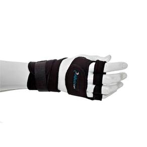 Munhequeira com regulagem por fecho aderente. Desenho aberto possibilitando maior mobilidade dos dedos, facilita a eliminação do suor e permite a respiração da pele. Retém o calor corpóreo, estimula a circulação sanguínea e deixa a região sempre aquecida e sob menos tensões.