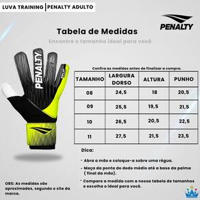 Instruções de Medida: Abra a mão e coloque-a sobre uma régua Meça do dedo médio até a base da palma Compare a medida com a tabela de tamanhos e escolha o mais adequado