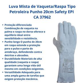 Especificações técnicas - Marca: Safety EPI. - CA: 37962. - Material: Palma em vaqueta, dorso e punho em raspa. - Comprimento do Punho: 20 cm. - Tipo: Mista (vaqueta/raspa), tipo petroleira.
