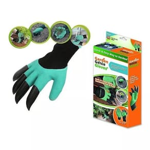 Par de luvas com garras para cavar e plantar. Possui garras apenas em uma mão (na mão direita). É flexível e a prova d'água. Antiderrapante, protege as mãos. Ideal para jardinagem, plantio, escavação. Cor: Verde. Material: Latex (borracha) e plástico ABS (garras).