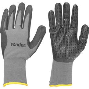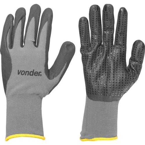 Luva Poliamida/borracha Nitrílica Tamanho 10 Ca34451 Vonder Conteúdo da embalagem 1 Par de luvas Aplicações e dicas de uso Indicada para proteção das mãos no manuseio de peças escorregadias, atividades de carga e descarga de materiais, em manutenções industriais, montadoras e autopeças e trabalhos que exijam aderência com excelente tato Destaques e diferenciais Possui pigmentos antiderrapantes de nitrilo na palma e face palmar dos dedos, proporcionando excelente aderência, além de punho tricotado em elastano com acabamento overloque DETALHES TÉCNICOS