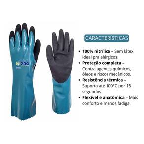 Principais vantagens e benefícios - 100% nitrílica: livre de proteínas do látex. - proteção completa: contra agentes químicos, mecânicos, óleos e graxas. - resistência térmica de até 100c: com intermitência de 15 segundos. - impermeável e antiderrapante: revestimento total com ótima aderência. - flexível e anatômica: mais conforto e performance no uso contínuo.