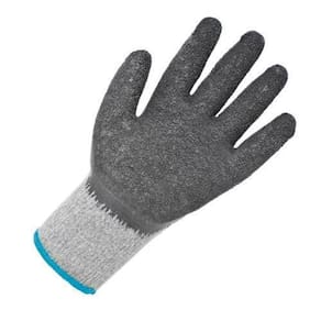 Características: Luva Tricotada em Algodão com Banho de Látex Corrugado Luva de segurança confeccionada em suporte têxtil. Malha de quatro fios de algodão cinza. Pigmentos com aplique em látex corrugado nas palmas, dedos e pontas dos dedos na cor preta. Punho com acabamento em elastano e costura em overloque. Aplicação: Trabalhos leves, médios e pesados, manuseio de materiais e produtos secos sob temperatura ambiente e agentes mecânicos abrasão, corte, rasgamento e perfuração em indústria metal-mecânica, construção civil, madeireira, plástica, cerâmica, coleta de lixo, jardinagem, uso doméstico e outros. Embalagem: 1 par Referência: PPm 03 Tamanho: 8 Código 290,0009 EAN:7898960479850