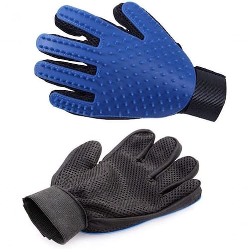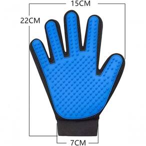 Escova no formato de luva para facilitar a remoção de pelos nas partes mais difíceis como calda ou rosto.