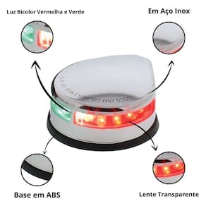 Informações adicionais: Material: aço inox Voltagem: 12v Lente: vermelha e verde Lâmpada: 2,2w, 0,18a Visibilidade: 2,5 milhas Fios: estanhados Dimensões: 77,1 x 33,7 mm Resistente ao ambiente marinho