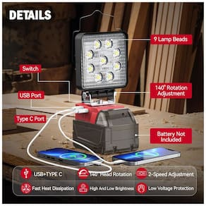 COMPATIBILIDADE DA BATERIA COM Compatível com todas as baterias de íon de lítio milwaukee 18v m18 48 11 1811, 48 11 1815, 48 11 1820, 48 11 1822, 48 11 1828, 48 11 1840 , 48 11 1841, 48 11 1850 e mais. DISSIPAÇÃO RÁPIDA DE CALOR Relativamente finas e densas, aletas ranhuradas de tamanho grande para eliminação rápida de calor, dissipador de calor multicamadas resolve o problema de calor após um longo trabalho. Estenda efetivamente a vida útil da barra além de 50.000 horas COM PLACA DE PROTEÇÃO DE BAIXA TENSÃO Equipada com proteção contra sobrecarga, sobrecorrente, superaquecimento, baixa tensão. Certifique se de que a bateria pare de funcionar quando a tensão da bateria for inferior a 15V e use a com confiança para evitar descarga excessiva da bateria e danos à bateria. COM PORTA DE CARGA USB E TIPO A cabeça rotativa de 140 graus oferece versatilidade para a bancada de trabalho iluminada. Luz projetada em várias direções. Com porta USB TYPEC Charge, você pode usá lo para carregar seu telefone, iPad, iPod e outros pequenos dispositivos eletrônicos. AMPLA APLICAÇÃO Esta luz de trabalho LED sem fio é fácil de transportar e é muito adequada para trabalhar em um ambiente escuro, bem como acampamento ao ar livre, caminhadas, pesca, caça, iluminação de emergência etc Marca: Não Informado