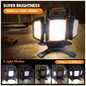 A luz de trabalho portátil tem 3 luzes, com luz principal de 20W e luzes laterais de 10W SMD, qualquer luz pode funcionar de forma independente. Pode produzir alto brilho de 700 Lumens a 3000 Lumens através do botão de controle, alterar livremente os 5 modos de luz Luz principal alta , Luz principal média , Uma luz lateral , Duas luzes laterais , Luzes completas e fácil de desligar por nosso exclusivo função de descanso automático.