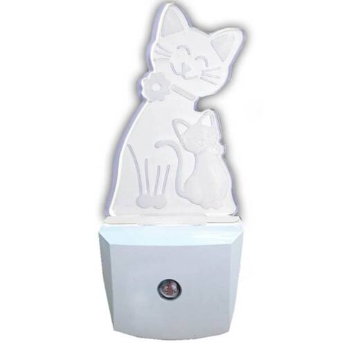 A luz noturna é uma luminária dedicada para quartos, corredores e banheiros. Ideal para crianças e adultos que não gostam de dormir no escuro total. Ótima durabilidade e baixíssimo consumo de energia 0,07 Watts. Design especial de fino acabamento, desenvolvido no formato de gato para decorar o ambiente. Possui iluminação suave com LED branco que funciona perfeitamente para orientação em corredores. Acende ao escurecer e desliga-se ao clarear, graças a fotocélula integrada na luminária. Acende alternadamente as duas imagens criando a ilusão de movimento.