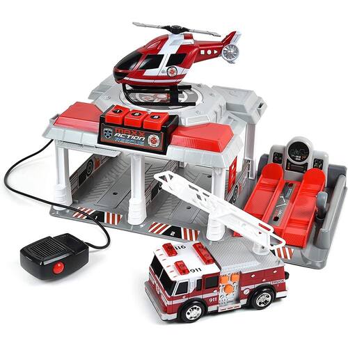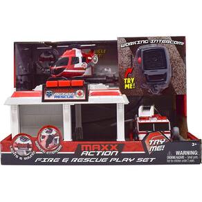 - Dois mini veículos: nenhum conjunto de bombeiros estaria completo sem veículos; o conjunto inclui um mini helicóptero e um mini caminhão de bombeiros. Cada veículo está equipado com luzes e sons, motor de fricção e pneus de plástico.
