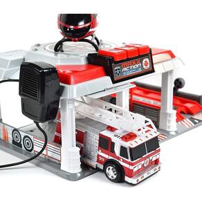 Conjunto de brinquedos de luzes e sons de garagem de bombeiros e resgate para crianças | Intercomunicador de trabalho com garagem de estacionamento aberto e fechado e elevador de veículos | O conjunto