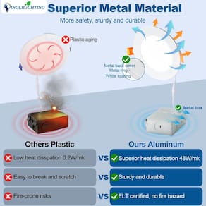 - 5. Instalação segura e fácil: Feitas com alumínio dissipador de calor e certificadas pela ETL/FCC, estas luzes embutidas de 15 cm são à prova de umidade e resistentes ao fogo. O design do clipe de mola garante a instalação sem ferramentas — basta encaixar no lugar! Desfrute de tranquilidade com uma garantia de 5 anos e devoluções de 30 dias.