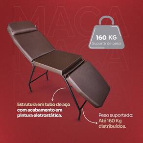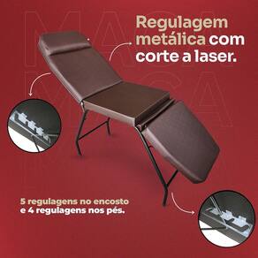 Conforto superior: estofado macio e suporte ergonômico para longas sessões. Espuma densidade d 28 com 5 cm de espessura Durabilidade: construída com materiais de alta resistência para garantir uma longa vida útil. Praticidade: por conta das suas regulagens proporciona várias posições para atender os mais diversos tipos de procedimentos. Possui regulagens de aço galvanizado com corte a laser, sendo 5 níveis de regulagens no encosto e 4 níveis de regulagens nos pés. Estilo moderno: design elegante que complementa qualquer ambiente de trabalho. Peso suportado: até 160 kg distribuídos.