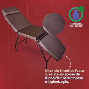 Modelo: maca 3 posições reclinável Estofado : de alta qualidade no tecido facto, o tecido facto é resistente ao uso de álcool 70 para limpeza e higienização. Material: estrutura aço com pintura eletrostática e mdf estofado Funcionalidade: ideal para estética, massagem, podologia e tattoo Dimensões: 75 alt. 54 larg. 180 comp. Cm Peso: 20 kg