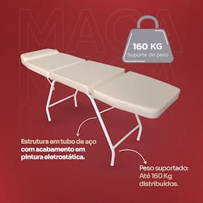 Conforto superior: estofado macio e suporte ergonômico para longas sessões. Espuma densidade d 28 com 5 cm de espessura Durabilidade: construída com materiais de alta resistência para garantir uma longa vida útil. Praticidade: por conta das suas regulagens proporciona várias posições para atender os mais diversos tipos de procedimentos. Possui regulagens de aço galvanizado com corte a laser, sendo 5 níveis de regulagens no encosto e 4 níveis de regulagens nos pés. Estilo moderno: design elegante que complementa qualquer ambiente de trabalho. Peso suportado: até 160 kg distribuídos.