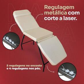 Conforto superior: estofado macio e suporte ergonômico para longas sessões. Espuma densidade d 28 com 5 cm de espessura Durabilidade: construída com materiais de alta resistência para garantir uma longa vida útil. Praticidade: por conta das suas regulagens proporciona várias posições para atender os mais diversos tipos de procedimentos. Possui regulagens de aço galvanizado com corte a laser, sendo 5 níveis de regulagens no encosto e 4 níveis de regulagens nos pés. Estilo moderno: design elegante que complementa qualquer ambiente de trabalho. Peso suportado: até 160 kg distribuídos.