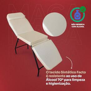Modelo: maca 3 posições reclinável Estofado : de alta qualidade no tecido facto, o tecido facto é resistente ao uso de álcool 70 para limpeza e higienização. Material: estrutura aço com pintura eletrostática e mdf estofado Funcionalidade: ideal para estética, massagem, podologia e tattoo Dimensões: 75 alt. 54 larg. 180 comp. Cm Peso: 20 kg