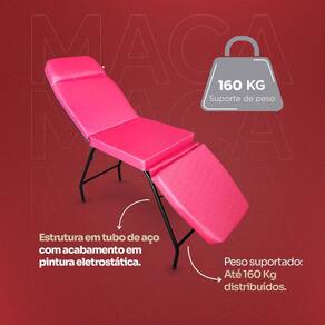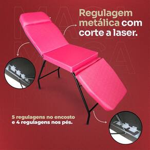Conforto superior: estofado macio e suporte ergonômico para longas sessões. Espuma densidade d 28 com 5 cm de espessura Durabilidade: construída com materiais de alta resistência para garantir uma longa vida útil. Praticidade: por conta das suas regulagens proporciona várias posições para atender os mais diversos tipos de procedimentos. Possui regulagens de aço galvanizado com corte a laser, sendo 5 níveis de regulagens no encosto e 4 níveis de regulagens nos pés. Estilo moderno: design elegante que complementa qualquer ambiente de trabalho. Peso suportado: até 160 kg distribuídos.