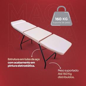 Conforto superior: estofado macio e suporte ergonômico para longas sessões. Espuma densidade d 28 com 5 cm de espessura Durabilidade: construída com materiais de alta resistência para garantir uma longa vida útil. Praticidade: por conta das suas regulagens proporciona várias posições para atender os mais diversos tipos de procedimentos. Possui regulagens de aço galvanizado com corte a laser, sendo 5 níveis de regulagens no encosto e 4 níveis de regulagens nos pés. Estilo moderno: design elegante que complementa qualquer ambiente de trabalho. Peso suportado: até 160 kg distribuídos.