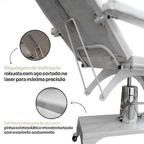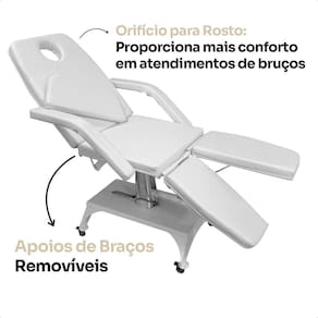 * Conforto Superior: Estofado macio com espuma D28 e espessura de 5 cm, garantindo bem-estar durante longos atendimentos * Ajustes Personalizados - Pés bipartidos que se movimentam separadamente - Sete níveis de regulagem nos pés para máxima adaptação, sendo 3 posições negativas para o cliente deitar de bruços - Cinco níveis de inclinação no encosto para diferentes posições * Orifício para Rosto: Proporciona mais conforto em atendimentos de bruços * Apoios de Braços Removíveis: Praticidade para ajustar conforme a necessidade * Durabilidade Excepcional - Regulagem de inclinação robusta com aço cortado no laser para máxima precisão - Borda de borracha nas três partes, aumentando a resistência e segurança - Rodízios em gel reforçados e com travas * Estilo Moderno: Visual sofisticado que agrega valor ao ambiente profissional