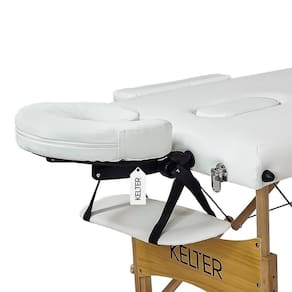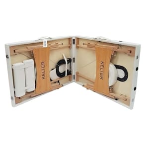 Maca Portátil Para Massagem Divã Dobrável Kelter M22T Branca Mesa de massagem dobrável + regulagem de altura + apoio para braços e cabeça + orifício + bolsa de transporte. Especificações Técnicas:Material da mesa: Madeira; Revestimento: Courvin; Espessura da espuma: 5cm; Peso máximo suportado: Até 250Kg; Tampa do orifício removível; Dimensões da mesa aberta sem apoio de braço e cabeça: 184cm X 60cm; Dimensões da mesa aberta com apoio de braço e cabeça: 210cm X 81cm; Dimensões apoio de Braço: 35cm X 11cm; Dimensões apoio de cabeça: 28cm X 28cm; Dimensões maca fechada: 91cm X 60cm X 17cm; Dimensões embalagem: 95cm X 18cm X 65cm; Regulagem de altura: 53cm à 75cm; Peso: 16kg. Itens Inclusos:1 Mesa de massagem; 1 Bolsa de transporte;