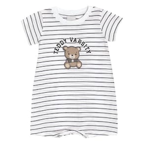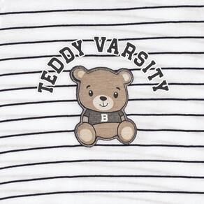 Macaquinho listrado branco divertido e leve para seu pequeno aproveitar o dia a dia e suas aventuras. Confeccionado em meia malha fio tinto possuí estampa frontal de urso com escrita "Teddy Varsity". A escolha ideal para seu baby curtir o dia com a mamãe.