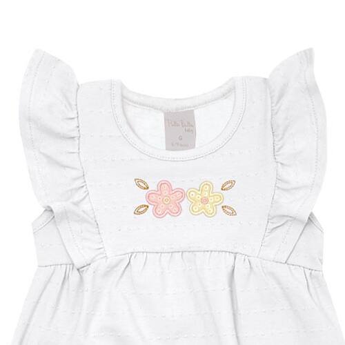 A opção fresquinha e fofinha para as pequenas aventureiras, o macacão possuí aplique bordado de flores no centro da peça, confeccionado em tecido cotton leve na cor branco. Toque fresco e macio, ideal para o conforta da sua bebê neste verão.\n
