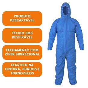 Macacão de segurança confeccionado em tecido não tecido (TNT) de polipropileno SMS, capuz de três peças com elástico, fechamento frontal com zíper bidirecional e aba protetora, elástico no punho para ajuste no dedo polegar, elástico na cintura, punhos e tornozelos.