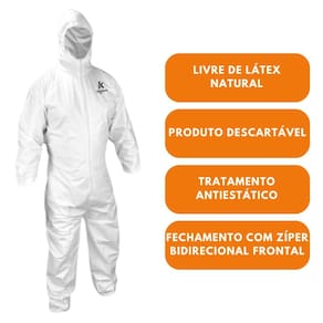 Macacão de segurança, confeccionado em tecido não tecido (TNT) de polipropileno com filme de polietileno micro poroso. Tratamento antiestético. Capuz de duas peças com elástico. Fechamento frontal com zíper bidirecional, sem aba protetora, elástico na cintura, punhos e tornozelos.