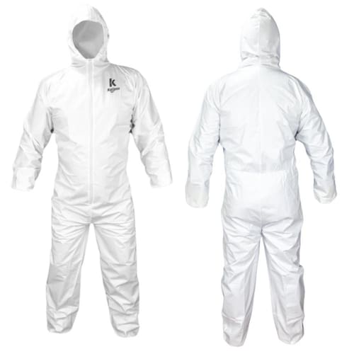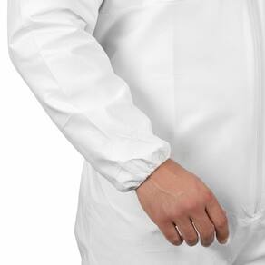 Macacão de segurança, confeccionado em tecido não tecido (TNT) de polipropileno com filme de polietileno micro poroso. Tratamento antiestético. Capuz de duas peças com elástico. Fechamento frontal com zíper bidirecional, sem aba protetora, elástico na cintura, punhos e tornozelos.
