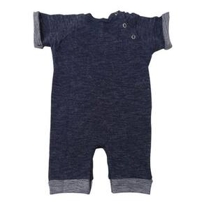 Esse pequeno macacão é gostoso, quentinho, macio. A malha é uma delícia. O corte é moderninho com bolsinho na parte da frente, manga curta e botões de pressão entre as pernas e no ombro direito que facilitam muito a hora troca. A padronagem lembra jeans estonado. A barra da perninha, a manga e a barra do bolsinho são em tom contrastante.