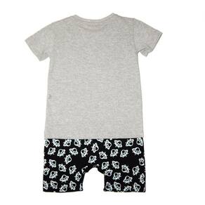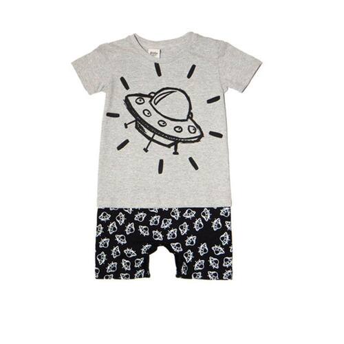 Macacão de bebê em malha levinha com estampa de naves espaciais. A parte superior parece uma camiseta e a parte inferior, com tecido estampado, parece um shortinho, dando a impressão de serem duas peças separadas. Entre as pernas, botões para ajudar na troca. Os pequenos vão se aventurar com muito conforto.