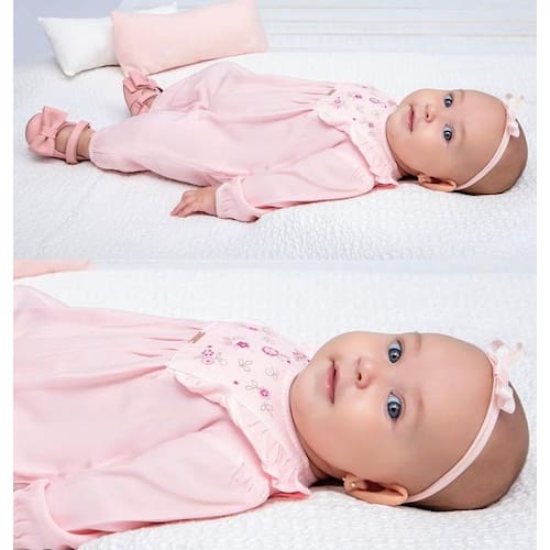 Macacão Longo Jeans Leve Bebê Menina Bordado Paraiso 15351 - RN - Rosa Claro