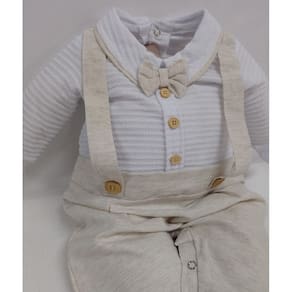 - Macacão finta suspensório em linho, super macio e confortável. Na parte superior em tecido trabalhado com detalhes de botões aplicados na frente e gravatinha borboleta, que dão um charme todo especial a peça. A parte inferior e alças em tecido composto por linho, na cintura detalhe de plaquinha da marca. Punhos ribanados. Aberturas com botões de pressão nas costas e entre pernas. Simplesmente um encanto!