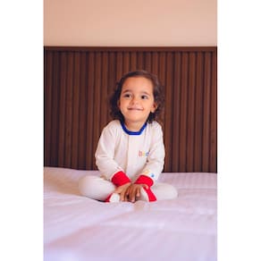 Macacão Magnético Off, detalhes vermelho e azul royal com letras e números nas mangas - 24 meses (2
