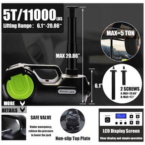SURPRESA ESCONDIDA Uma mangueira de entrada de ar no macaco do carro pode fornecer gás suficiente para o pneu furado, você pode monitorar um pressão do pneu em um momento de qualificação gravada no LCD no macaco. Enquanto isso, este kit de tomate para carro elétrico de 5 toneladas de peso de outrora, para outros itens para outras finalidades. Por exemplo, uma agulha do inflador de ar pode ser usada para inflar futebol, basquete e etc. Mais surpresas merecem sua descoberta.