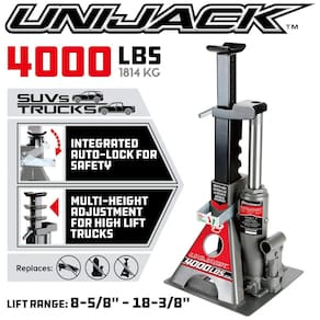 FORTE: O Unijack eleva e suporta uma variedade de veículos com capacidade de 1.814,37 kg 4.000 libras e faixa de elevação de aproximadamente 21,91 a 47,31 centimetros 8 5, 8 a 18 5, 8.