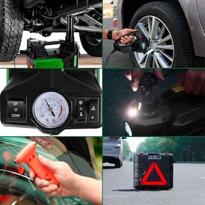 Este kit também inclui uma chave de impacto elétrica para remover e fixar porcas e parafusos com agilidade, uma lanterna para iluminação em locais de baixa visibilidade, um martelo de segurança para emergências e um triângulo de sinalização integrado, garantindo que sua segurança seja a prioridade. Todos esses componentes essenciais são acomodados em uma maleta prática e resistente, facilitando o transporte e o armazenamento no veículo.
