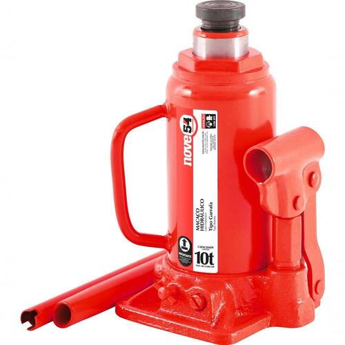 Macaco Hidráulico Garrafa 10 Toneladas 1 Estágio - Nove54 Conteúdo da embalagem 1 Macaco hidráulico tipo garrafa com 1 cabo de acionamento Aplicações e dicas de uso Indicado para elevação de veículos ou cargas de acordo com sua capacidade. Usar, armazenar e transportar somente na posição vertical para evitar vazamento de óleo. Quantidade total de óleo hidráulico: 136 ml Destaques e diferenciais Possui válvula de segurança para evitar elevação superior à sua capacidade, cabo dividido em 2 partes que facilita seu armazenamento e fuso de elevação com rosca que proporciona maior elevação e facilita o ajuste no momento da aplicação, além de alça lateral que facilita o manuseio DETALHES TÉCNICOS