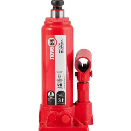 Macaco Hidráulico Garrafa 3 Toneladas 1 Estágio - Nove54 Conteúdo da embalagem 1 Macaco hidráulico tipo garrafa com 1 cabo de acionamento Aplicações e dicas de uso Indicado para elevação de veículos ou cargas de acordo com sua capacidade. Usar, armazenar e transportar somente na posição vertical para evitar vazamento de óleo. Quantidade total de óleo hidráulico: 68 ml Destaques e diferenciais Possui válvula de segurança para evitar elevação superior à sua capacidade, cabo dividido em 2 partes que facilita seu armazenamento e fuso de elevação com rosca que proporciona maior elevação e facilita o ajuste no momento da aplicação DETALHES TÉCNICOS