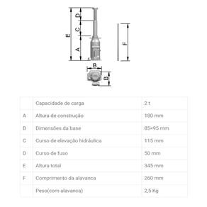 Especificações Técnicas Capacidade: 2 Ton Estágios de Elevação: 1 Estágio Altura de construção: 180mm Dimensões da base: 85X95mm Curso de elevação hidráulica: 115mm Curso de fuso: 50mm Altura total: 345mm Comprimento da alavanca: 260mm