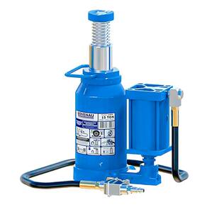 Macaco garrafa hidropneumático, reúne a segurança e estabilidade da hidráulica com a velocidade e praticidade do ar comprimido, tornando prático, rápido e leve a necessidade de elevar. Utilizado para reparos e manutenções na suspensão e rodas de veículos. Pressão necessária do ar comprimido para atingir a capacidade nominal do macaco 15 Ton = 100psi Ou 7 Bar de Pressão