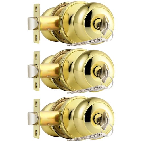 Especificações: Parte de trás: Ajustável para 60 mm ou 70 mm Espessura da porta: 1-3/20.3 cm ou 1-3/10.2 cm (35 mm-45 mm) Entrega: Esquerda, Direita, Reversível Diâmetro do botão: 5,7 cm (57 mm) Diâmetro da roseta: 6,5 cm (65 mm) Função de privacidade: Os conjuntos de maçanetas de porta de privacidade Probrico são trancados pelo interior com um giro de polegar, desbloqueados com um pequeno orifício de pino/moeda do lado de fora. Os puxadores de privacidade são ideais para banheiros, quartos ou qualquer lugar em que uma porta de bloqueio seja desejada, mas um cilindro com chave não é necessário. Fácil de instalar: A instalação é fácil, tudo o que você precisa é de uma chave de fenda e um pouco de tempo. Este conjunto é projetado para caber em portas de preparação padrão e a maioria das instalações deve levar menos de uma hora. Alta qualidade: Certificação ANSI Grau 3 que indica excelente desempenho em uma variedade de aplicações residenciais. Este produto é feito de materiais de alta qualidade para lhe dar segurança excepcional - Confirme com ANSI Grau 3, excede 200.000 ciclos; cilindro de latão resistente a palhetas de 5 pinos, chave de latão niquelado. Resistente ao desgaste e à corrosão - Acabamento de latão polido: anti-impressão digital, mais atraente, durável e livre de ferrugem; alça esférica moderna, sem bordas afiadas, arredondada sem machucar as mãos - Maçaneta de porta com chave de entrada com função de trava e chave: utilizado em portas externas onde é necessária entrada com chave e segurança; todo o pacote combo terá a mesma chave - As travas têm um assento traseiro ajustável de 2-3/20.3 cm a 2-3/10.2 cm para caber em todos os preparativos de porta padrão: Serve para espessura da porta: 35 mm a 45 mm); Reforçar a trava prolonga efetivamente a vida útil da fechadura da porta. Ele garante que a porta esteja silenciosa e também possa ser resistente a impactos, para que você não tenha medo de bater na porta - Operação universal/reversível: adequado para portas direita e esquerda; Lista de acessórios: Maçaneta selecionada, trava sólida, parafusos, chaves, instruções de instalação e todas as ferragens de montagem necessárias. A instalação é muito fácil